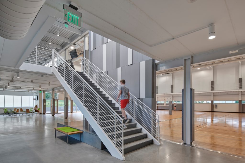 There are two courts with maple wood floors and one court with all-purpose hard surface flooring. Each space has middle school sized basketball courts. All three courts can be divided by curtains. The multi-purpose space opens to the outdoor patio and is close to the kitchen/concession area, and social lounge. Recommended room allowance is 150 people/court.