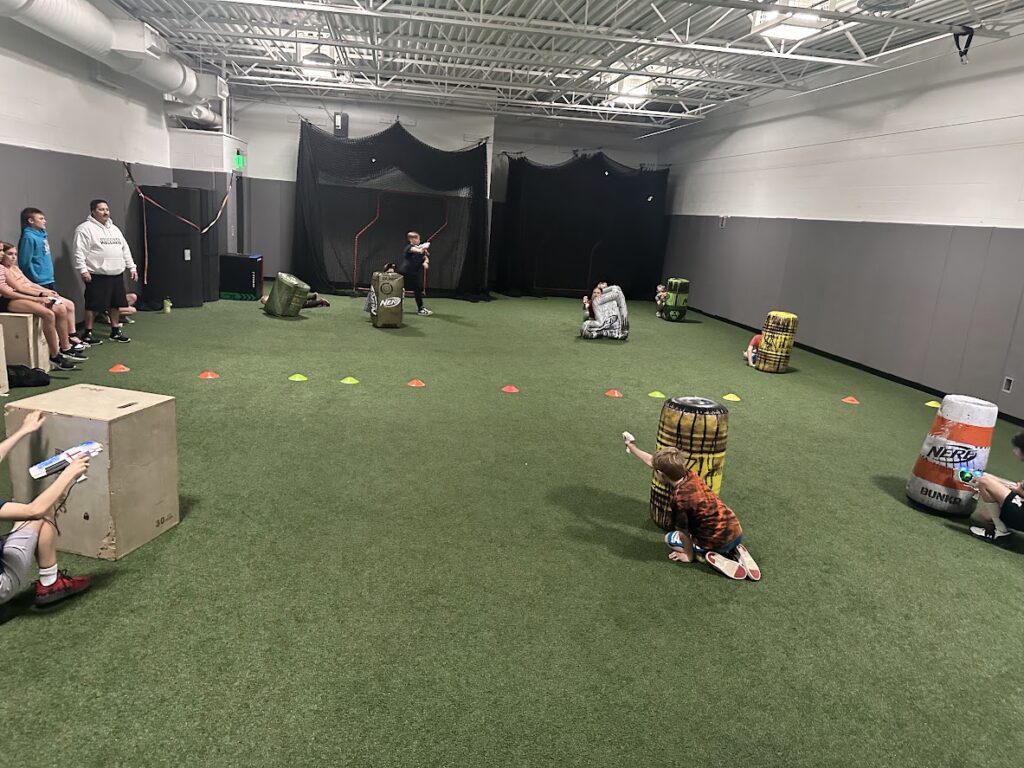 This large room has synthetic turf and padded walls. Rental of the room has the optional use of 2 batting cages/golf nets or competition size wrestling mat, which are included in the rental fee (set up fees may apply). This room can accommodate approximately 40 people depending on type of use.