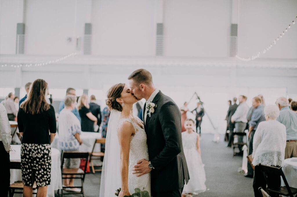 There are two courts with maple wood floors and one court with all-purpose hard surface flooring. Each space has middle school sized basketball courts. All three courts can be divided by curtains. The multi-purpose space opens to the outdoor patio and is close to the kitchen/concession area, and social lounge. Recommended room allowance is 150 people/court.